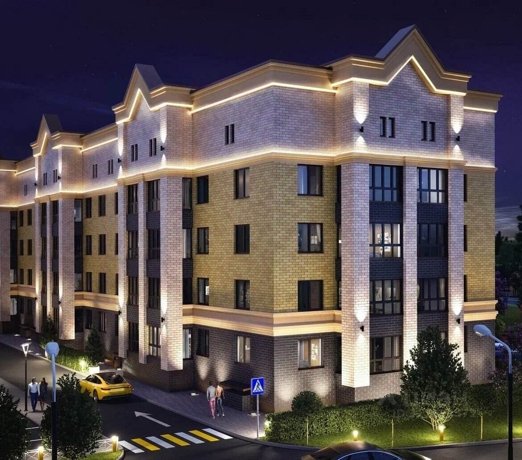 Невысокие корпуса в элегантном английском стиле, фасады в мягких, тёплых оттенках, вечерняя архитектурная подсветка создают атмосферу загородного уюта.